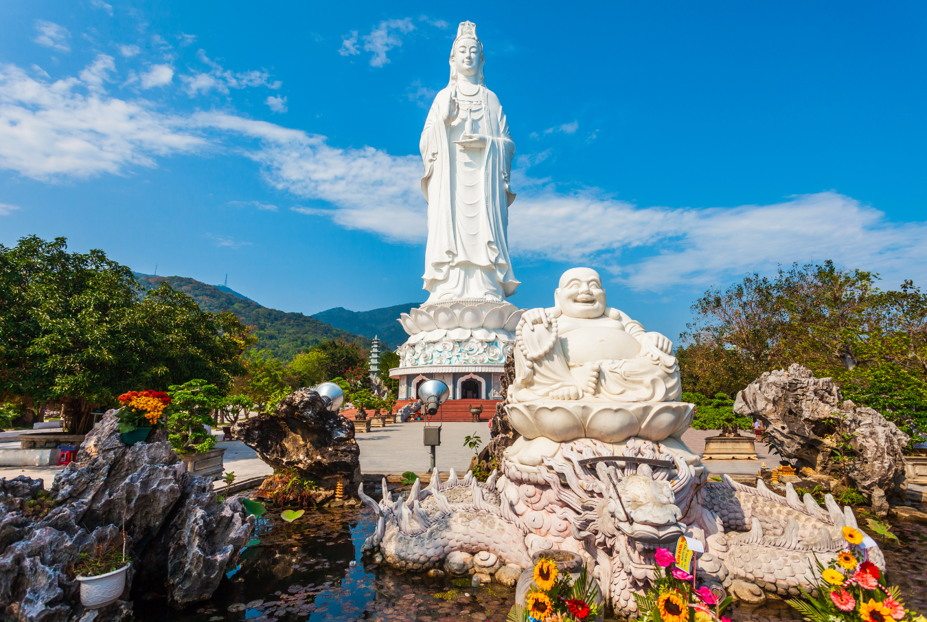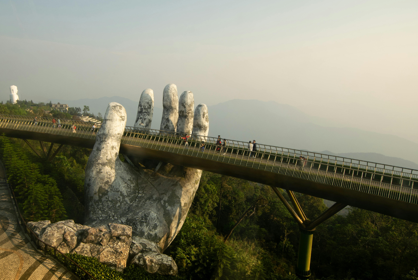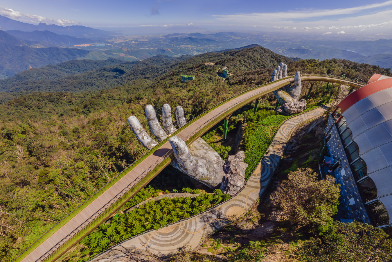 Stepping off the first cable line, you’ll make your way to the iconic Golden Bridge. Supported by giant stone-like hands emerging from the mountainside, this architectural marvel offers breathtaking photos and panoramic vistas. Continue to Le Jardin d’Amour, where themed gardens and peaceful corners create a charming atmosphere, and visit Linh Ung Pagoda, home to elegant Buddhist sculptures.