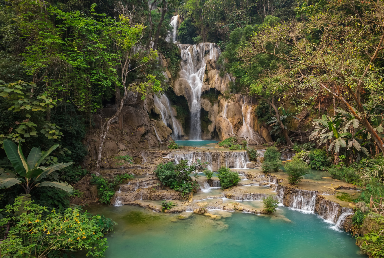 After breakfast, meet your English-speaking guide and private driver to begin exploring the former royal capital. Start with the Royal Palace Museum, built in 1904 during the French colonial period for King Sisavang Vong and his family. Then take a scenic one-hour drive south to the Kuang Si Waterfall, one of Luang Prabang’s most stunning natural sites. Walk down to the base of the falls, where you can swim in turquoise pools, relax, or visit the nearby bear sanctuary. On the return journey, stop at Ban Thapene, a Khmu village known for its tranquil pools linked to the waterfall. Back in town, continue your cultural discovery at Wat Sene and the splendid Wat Xiengthong, a masterpiece of Lao temple architecture with its sweeping rooflines and colorful mosaics, including the famous “Tree of Life” glass mural. Visit the 16th-century Wat Visoun, the oldest operating temple in the city, renowned for its distinctive stupa. As the day ends, head to Wat Prabath, the perfect spot to watch the sun dip below the horizon, casting a golden glow over Luang Prabang.